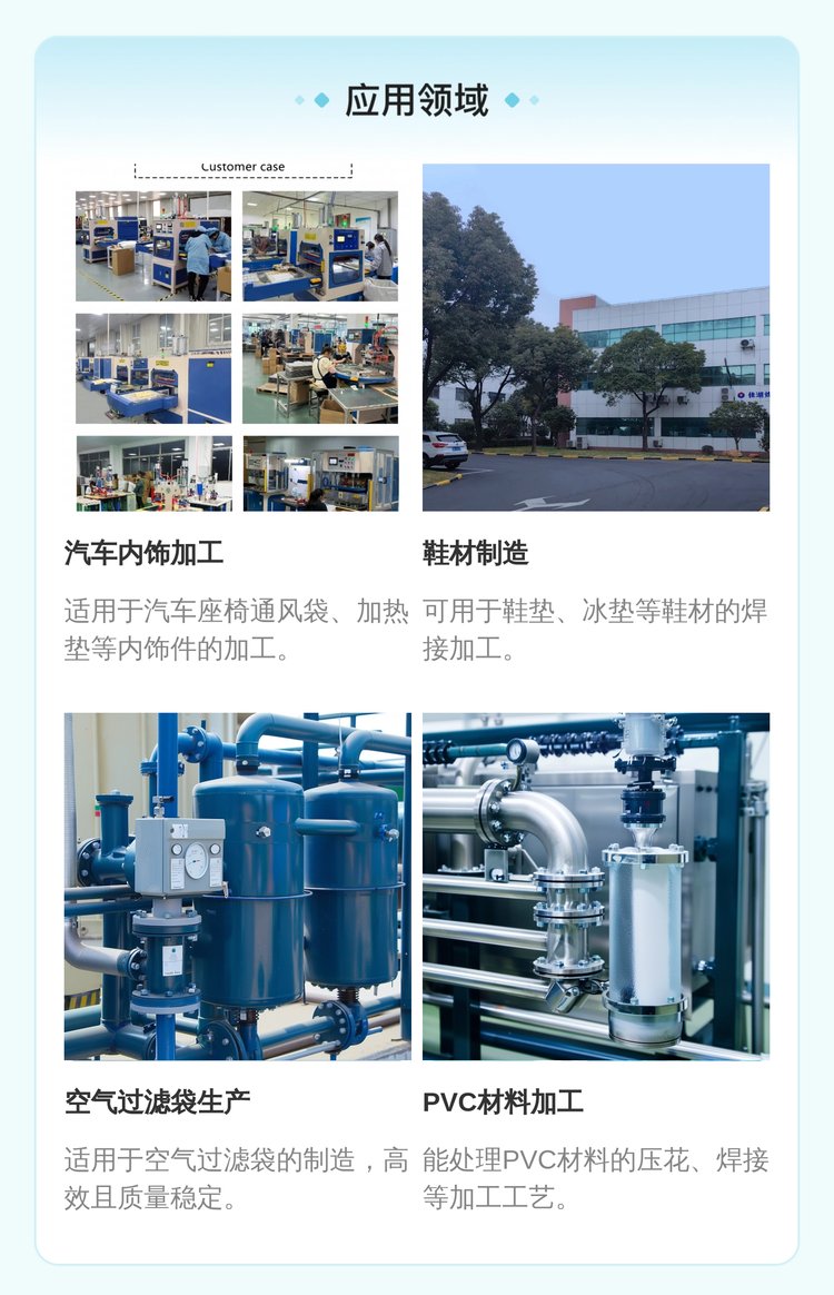机械用途 | PVC、TPU、PU 皮革压花,EVA、布类鞋垫压花,汽车脚垫、TPU 汽车座椅通风袋、空气过滤袋、汽车吸音隔音棉、车用门板内衬 PVC 海绵隔音垫焊接加工,PVC 冰垫焊接等需要熔接又同步熔断的产品。 | ||