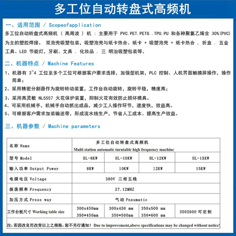 机械优势 | 该机设有高灵火花保护装置,高周输出大,稳定可靠,加强型机架,省时省力省空间,操作简便,生产效率高。 | ||