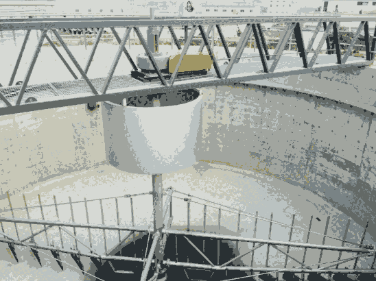刮臂在驱动机构带动下,绕池中心轴线旋转,安装在刮臂上的一组刮泥板在随刮臂旋转中,将沉降在池底的污泥刮向池中心集泥池,同时,液面上的浮渣在浮渣刮板周边挡渣堰形成的渐缩区域内集中,由浮渣刮耙扒到集渣斗,排出池外。