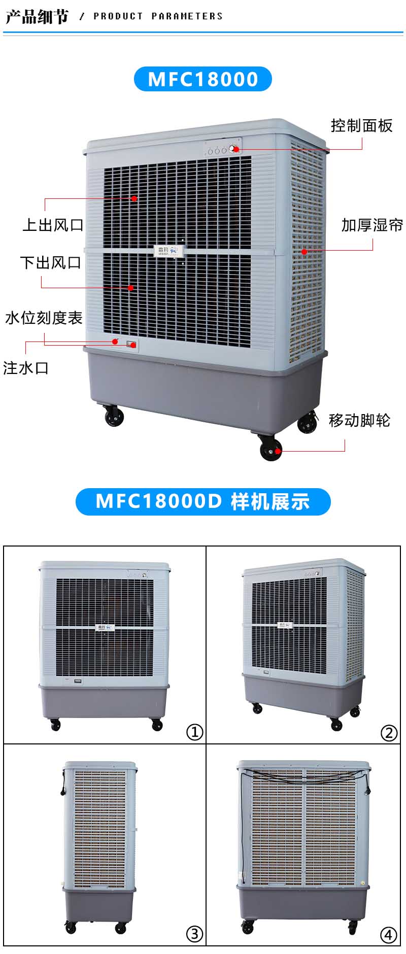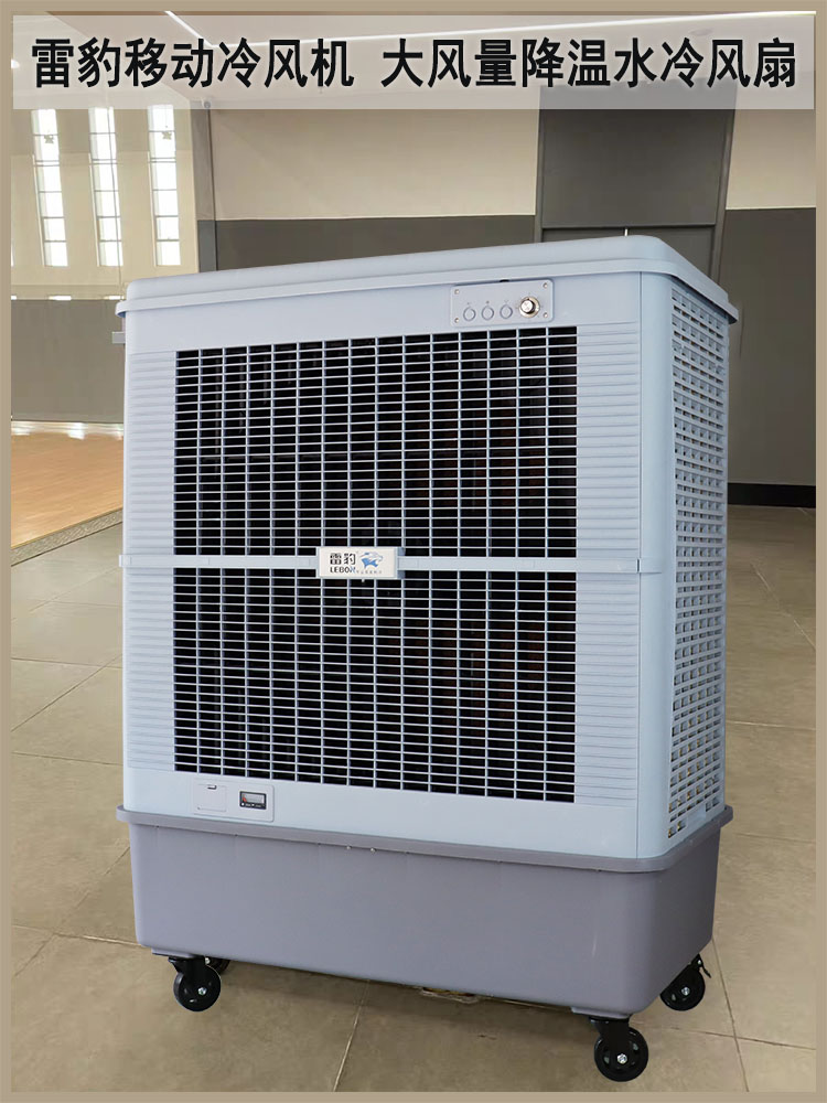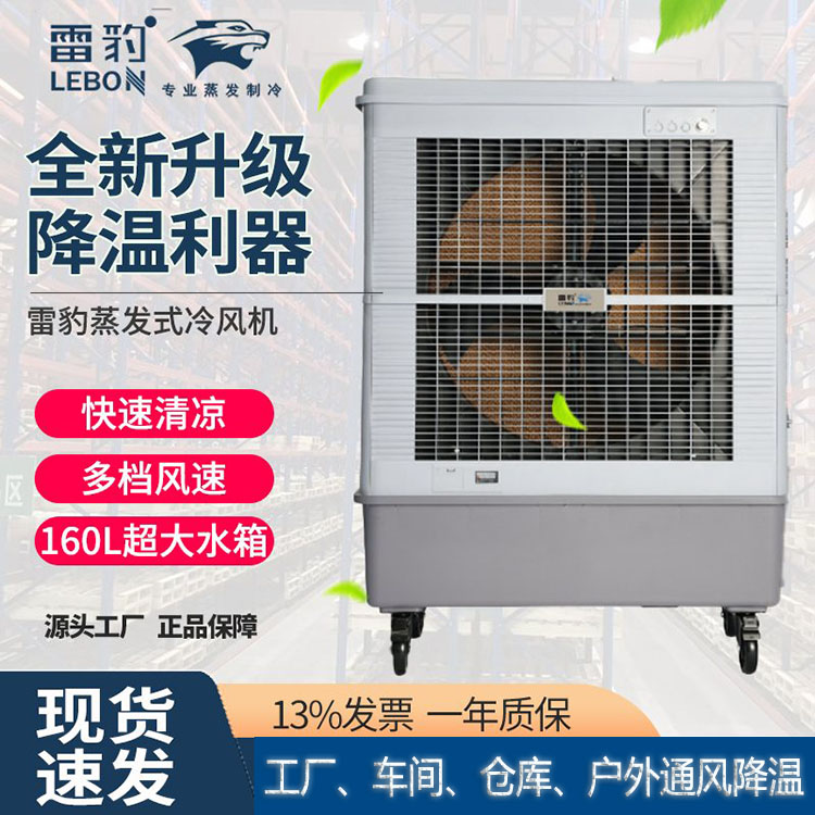 雷豹大型可移动冷风机MFC18000D是工厂、车间通风降温的神器,带刹的重载脚轮,可选配的软管接头,设计的多功能托盘,20米送风距离,500W超大功率,160L超大水箱,耗水量25L/Hr,无需频繁加水,降温面积可以达到150-200m2,大面积降温,清凉不在话下,植物纤维冰帘,实现大面积降温,过滤净化输送 洁净冷空气,轻松享受清新空气,直流风机高性能,低能耗,七档风速随心调节,多区间档位选择,根据使用环境随意切换,随心享受,远距离广角送风,大出风口设计,左右自动大范围摆风,上下固定广角送风。