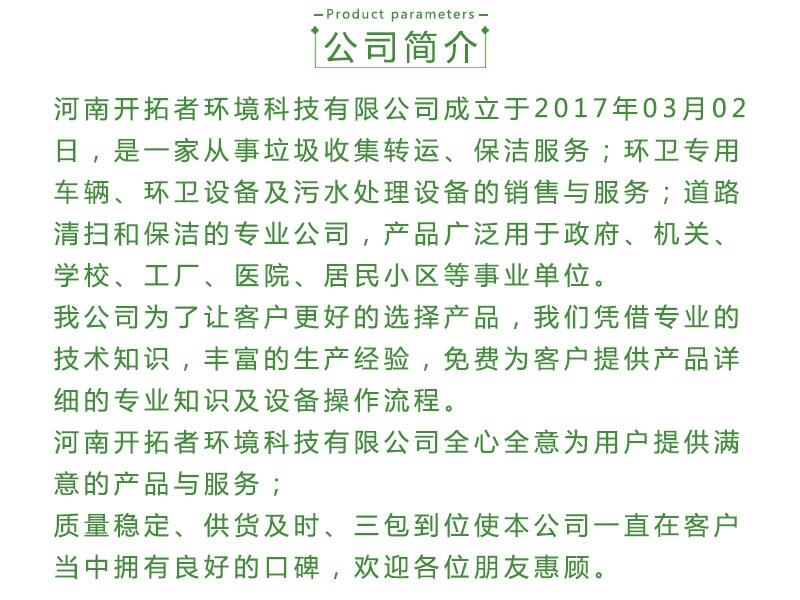 设备适用于人力三轮车,手推车,电动三轮车,侧装式垃圾车,勾臂式垃圾车收集,可从两侧和前面均可倒入垃圾,使用方便。