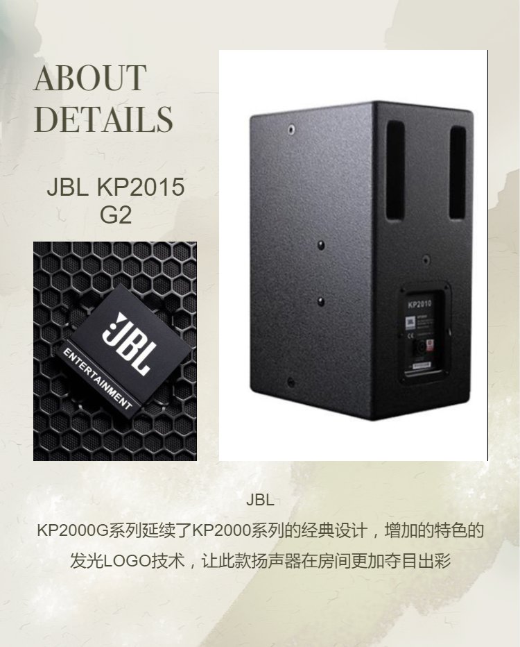 KP2015G2 采用 JBL 标志性的 KTV 调音,提供卡拉 OK 爱好者和场地所有者熟悉和喜爱的传奇声音。除了出色的音质外,KP2015G2 还具有与 KP G2 系列其他产品相匹配的新颖、引人注目的外形。凭借这种统一的外观,您可以混合搭配整个产品组合中的模型,以创建youzhi的 KTV 系统。此外,KP2015G2 包括一个可旋转的发光 JBL Entertainment 标志,让您可以在您的场所展示zhuming的 JBL 品牌。总而言之,KP2015G2 凭借纯净的音频和引人注目的美学效果,提升了 KTV 场所的品质,并提供令人难忘的卡拉 OK 体验。