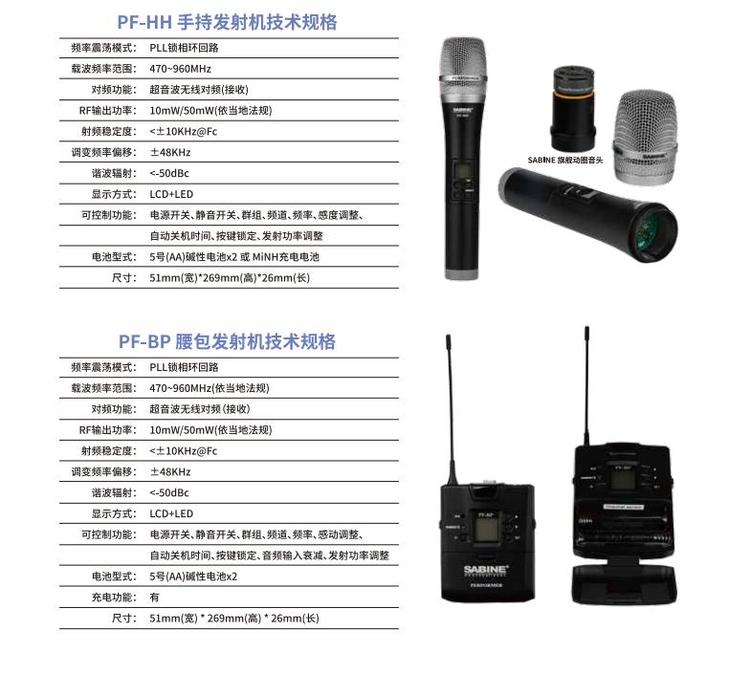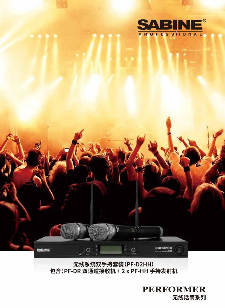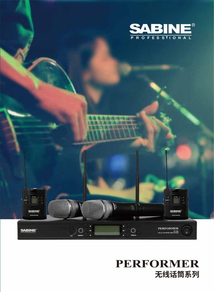 SABINE PERFORMER 系列无线话筒系统主要包括以下几个组成部分:PF-DR 接收机,PF-HH 手持发射机,PF-BP 腰包发射机,PF-LV-40 领夹式麦克风,PF-DEHW-40 头戴式麦克风。
