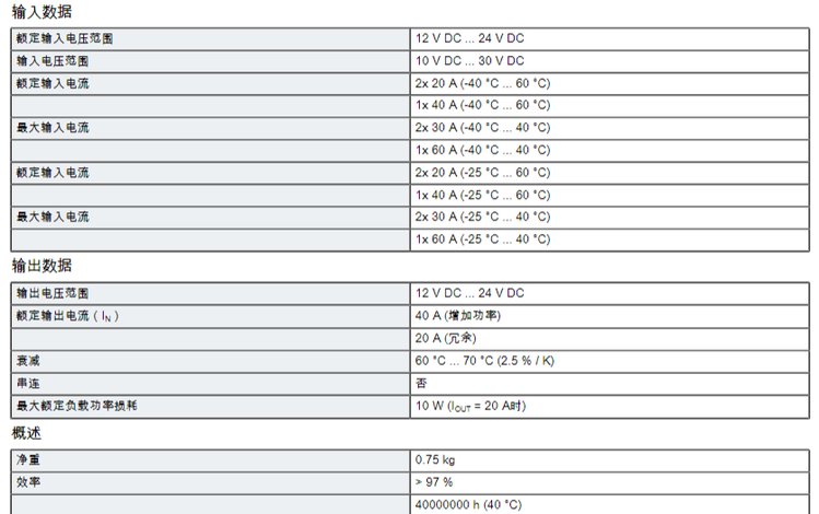 额定输入电流(IN) 2x 20 A (-40 °C 60 °C)