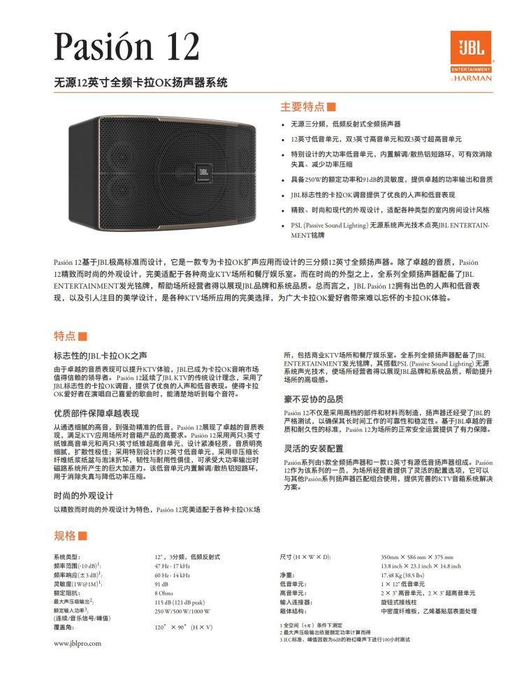 Pasion 12基于JBL极高标准而设计,它是一款专为卡拉OK扩声应用而设计的三分频12英寸全频扬声器。除了卓越的音质,Paion12精致而时尚的外观设计,完美适配于各种商业KTV场所和餐厅娱乐室。而在时尚的外型之上,全系列全频扬声器配备了JBLENTERTAINMENT发光铭牌,帮助场所经营者得以展现JBL品牌和系统品质。总而言之,JBLPaion 12拥有出色的人声和低音表现,以及引人注目的美学设计,是各种KTV场所应用的完美选择,为广大卡拉OK爱好者带来难以忘怀的卡拉OK体验。