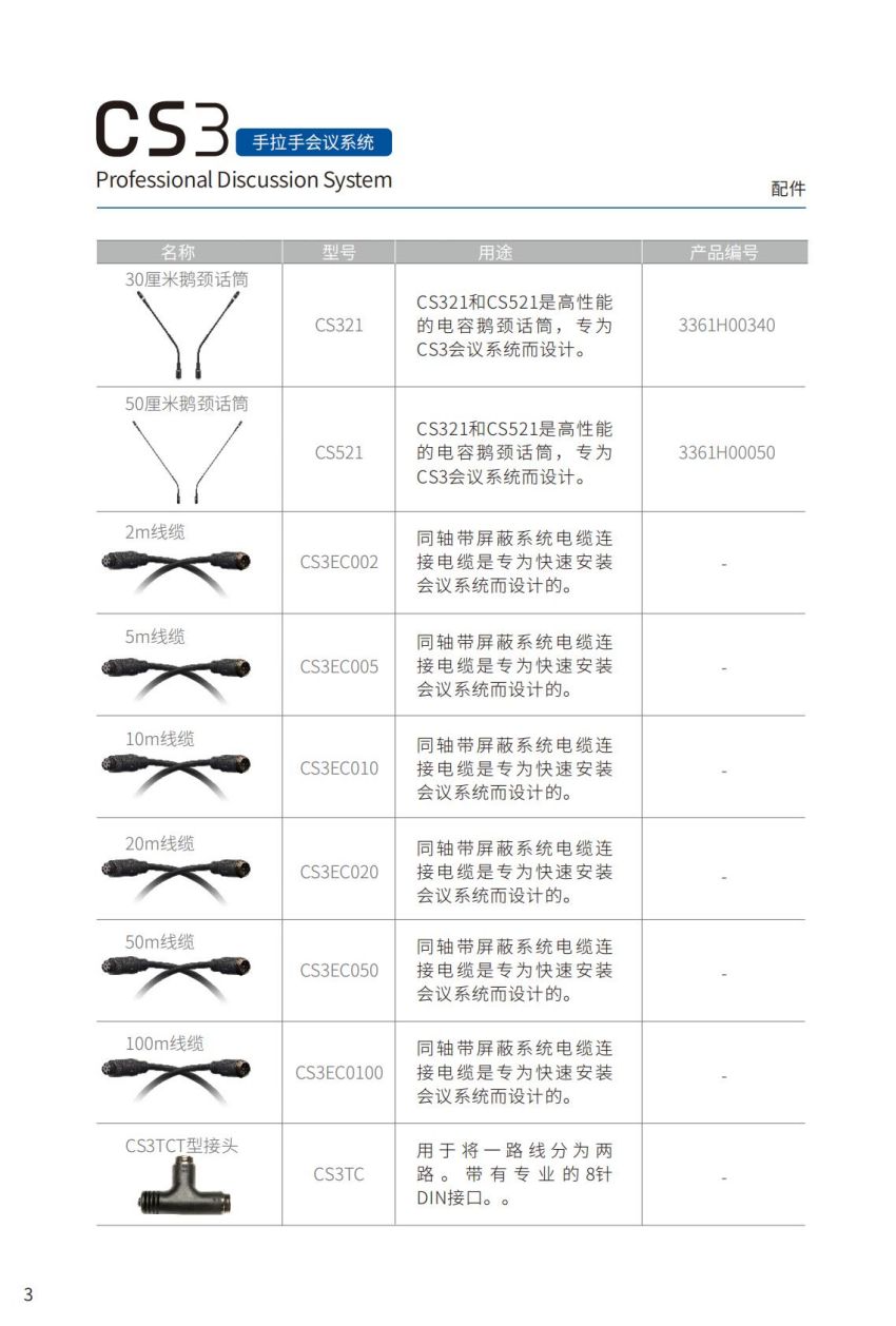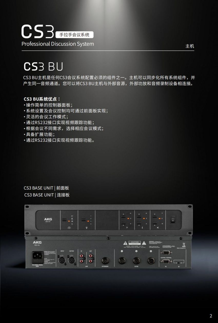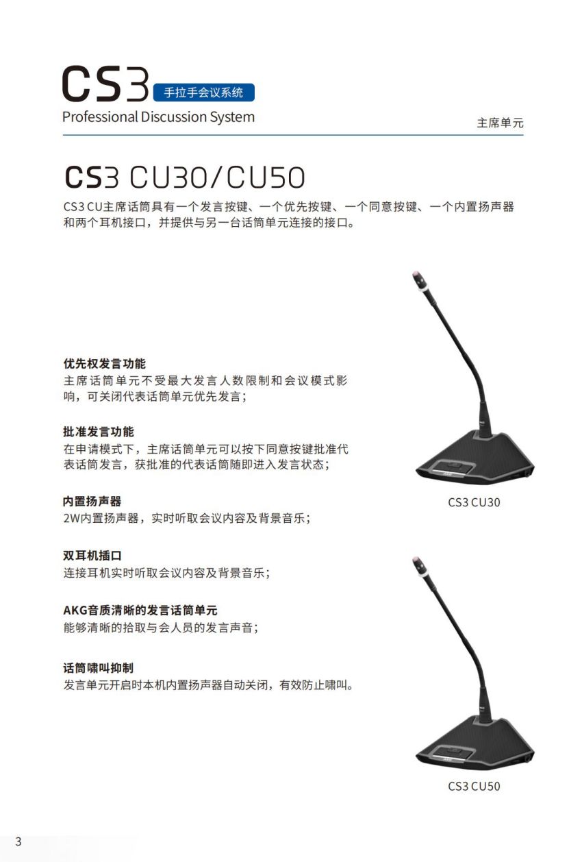 CS 3 CU30/CU50CS3CU话筒具有?个发?按键、?个优先按键、?个同意按键、?个内置扬声器和两个?机接?,并提供与另?台话筒单元连接的接?。单元优先权发?功能3话筒单元不受最?发??数限制和会议模式影响,可关闭代表话筒单元优先发?;批准发?功能在申请模式下,话筒单元可以按下同意按键批准代表话筒发?,获批准的代表话筒随即进?发?状态;内置扬声器2W内置扬声器,实时听取会议内容及背景?乐;双?机插?连接?机实时听取会议内容及背景?乐;AKG?质清晰的发?话筒单元能够清晰的拾取与会?员的发?声?;话筒啸叫抑制发?单元开启时本机内置扬声器?动关闭,有效防?啸叫。