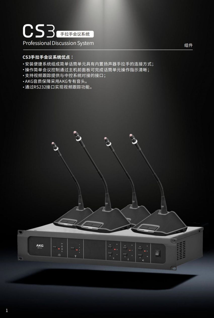 CS3会议系统是一套模块化的灵活的会议系统,适用于中小型会议应用。它可靠的组件能很简单地组装、布线和扩展。一台CS3主机单元可以支持60台话筒单元。主机单元可以连接相关设备如PA、录音机、外部音源和录像控制系统。不同的操作模式可以实现自动或操控会议,而不需要电脑控制。 CS3话筒单元带有一个牢固的接口,可以简单地替换话筒。话筒可选择CS321或CS521鹅颈话筒,它们均带有心形指向电容拾音头,分别长30厘米(12英寸)和50厘米(20英寸)。 CS3安装便捷、使用简单,而且还保持了AKG一贯的优良音质。其牢固和优雅的设计可用于任何地方。