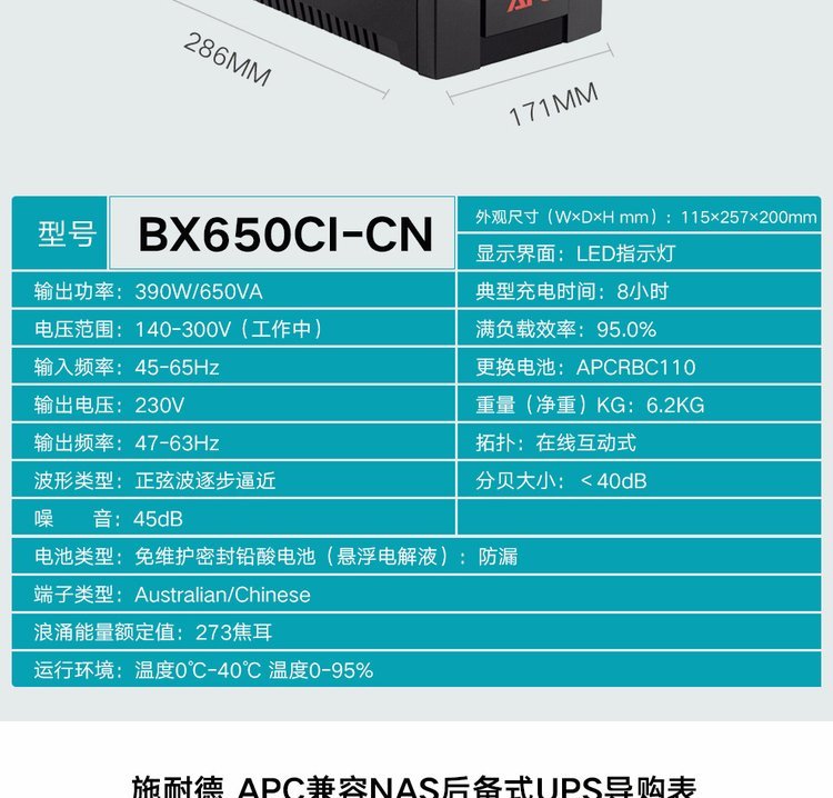 APC 自营时效 BX650CI-CN 不间断电源 UPS 390W/650VA 品牌 | APC | ||