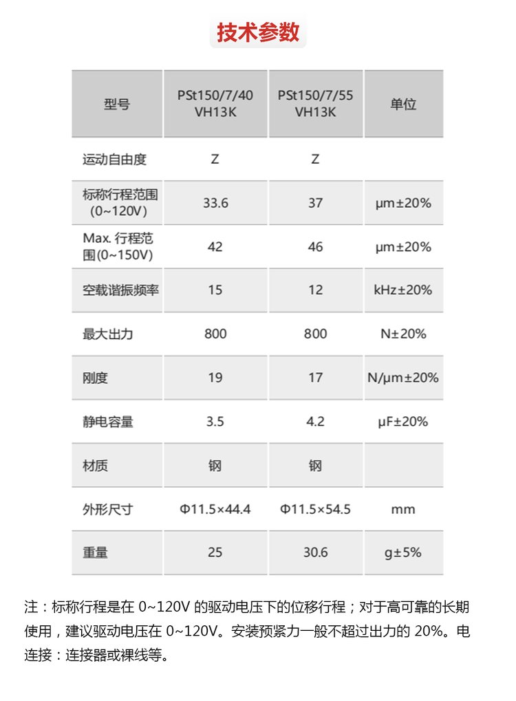 VH13系列金属密封压电促动器一维Z向位移有42μm、46μm两种行程