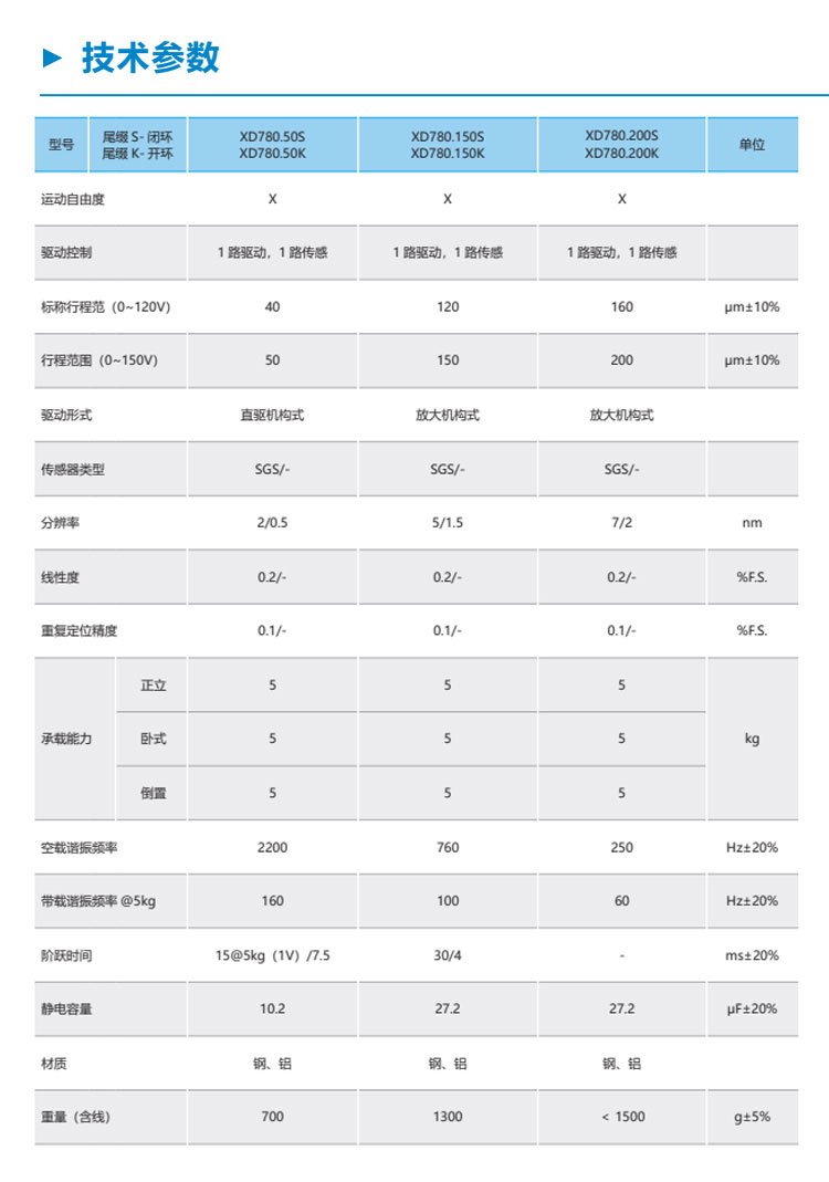 XD780系列压电纳米定位台可实现一维X向运动,有50μm、150μm和200μm可选