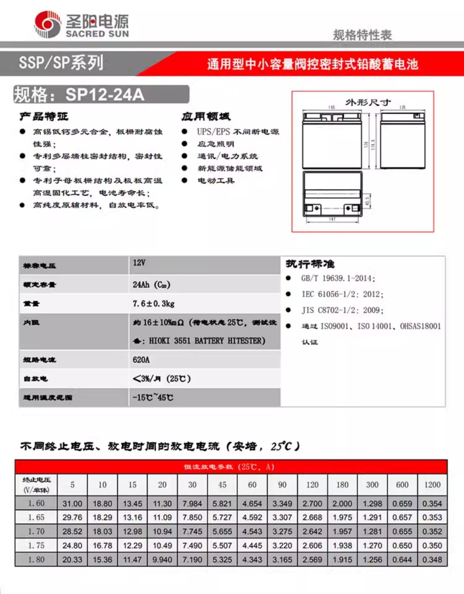 圣阳免维护蓄电池SP12-24/12V24AH密封式铅酸电源EPS UPS专用 是否支持加工定制 | 否 | ||