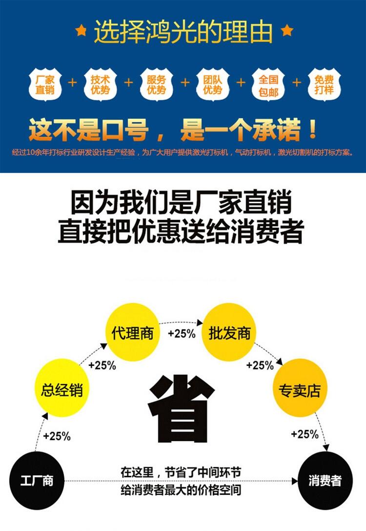 公司是专业一家生产销售标识标记设备的高科技企业,主要产品包括:打标机、气动打标机、激光打标机.喷码机,打标机喷码机配件与维修。公司产品广泛应用于汽车、摩托车、挂车、电动车配件、液压件、水泵、机械设备、法兰、胶管接头、电器设备、金属管件,工程机械、医疗器械、船舶、食品、化工等领域,便于产品的质量追踪和防伪,从而提升产品形象,适合于对钢、铜、铝、合金、塑料等各种金属或非金属铭牌标牌零部件的平面及圆柱形工件,生产日期号合格证号进行打标喷码。鸿光精密电子科技,您身边的打标机顾问专家!