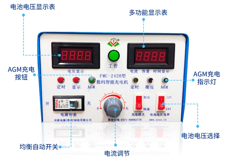 2. 接通电源,打开电源开关,这时数码管点亮,电压表显示电池电压,电流表无指示。此时根据电池大小缓慢调节旋钮使电流表显示到所需值即可(一般是电池容量的十分之一)。