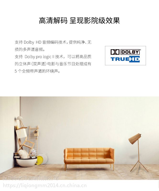 摆脱连线束缚 让高清影音触手可及 颠覆传统的真正高清无线家庭系统,支持4k高清画质,8通道高清解码音频,以极低延时无线传输至7个无线扬声器和1个无线低音炮,发烧音质,影院音效,无需布线,自由扩展,智能控制。
