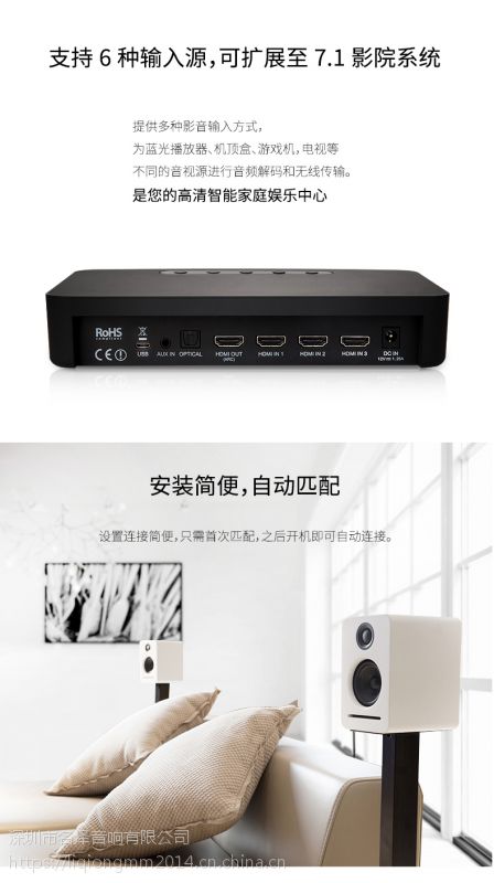 支持6钟输入源,可扩展至高清7.1影院系统,取代复杂av功放,提供多种影音输入方式,为蓝光播放器、机顶盒、游戏机、电视等不同的音视频进行音频解码与无线传输,音乐与影院音效可选,