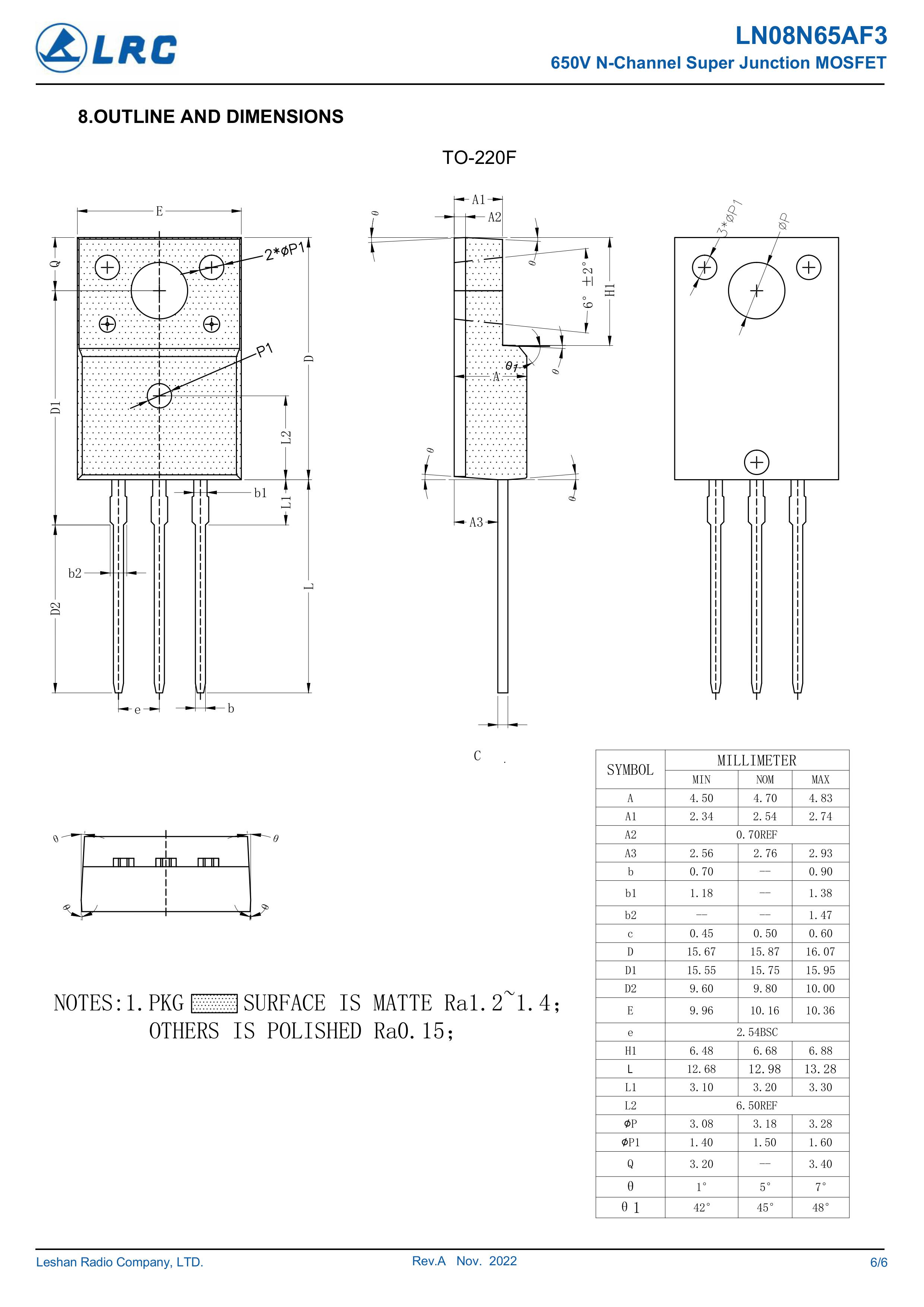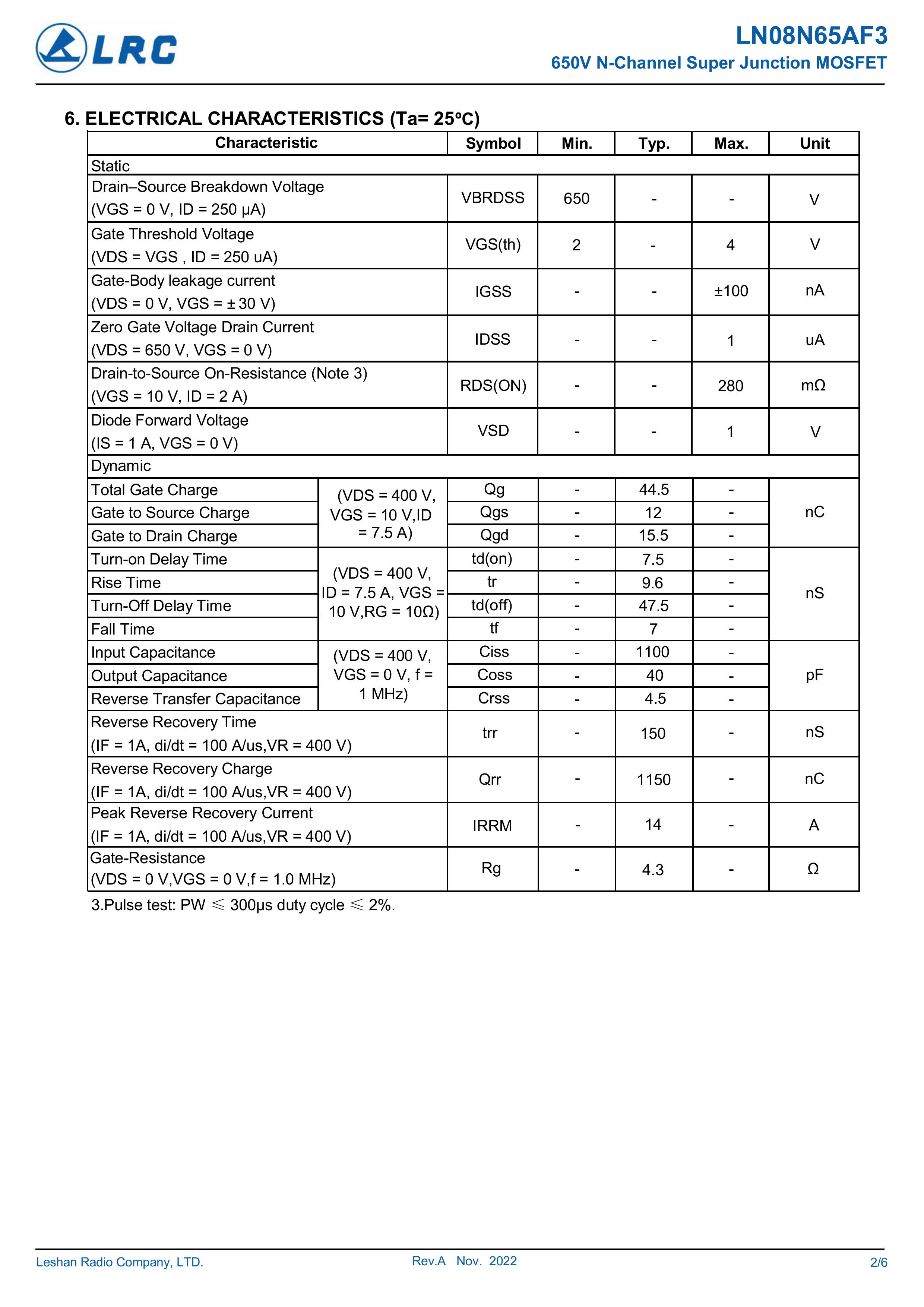 "页面标价非成交价,请联系详询报价” LRC/乐山无线电 全新原厂原装高频高压功率控制开关管场效应管,650V,8A,0.28Ω,N-Channel,高压MOSFET:LN08N65AF3/08N65AF;电压Vds:650V;电流Id:8A;内阻Rds(on):280mΩ;封装方式:TO-220F-3L;最小包装数量:1000pcs/盒-管装。