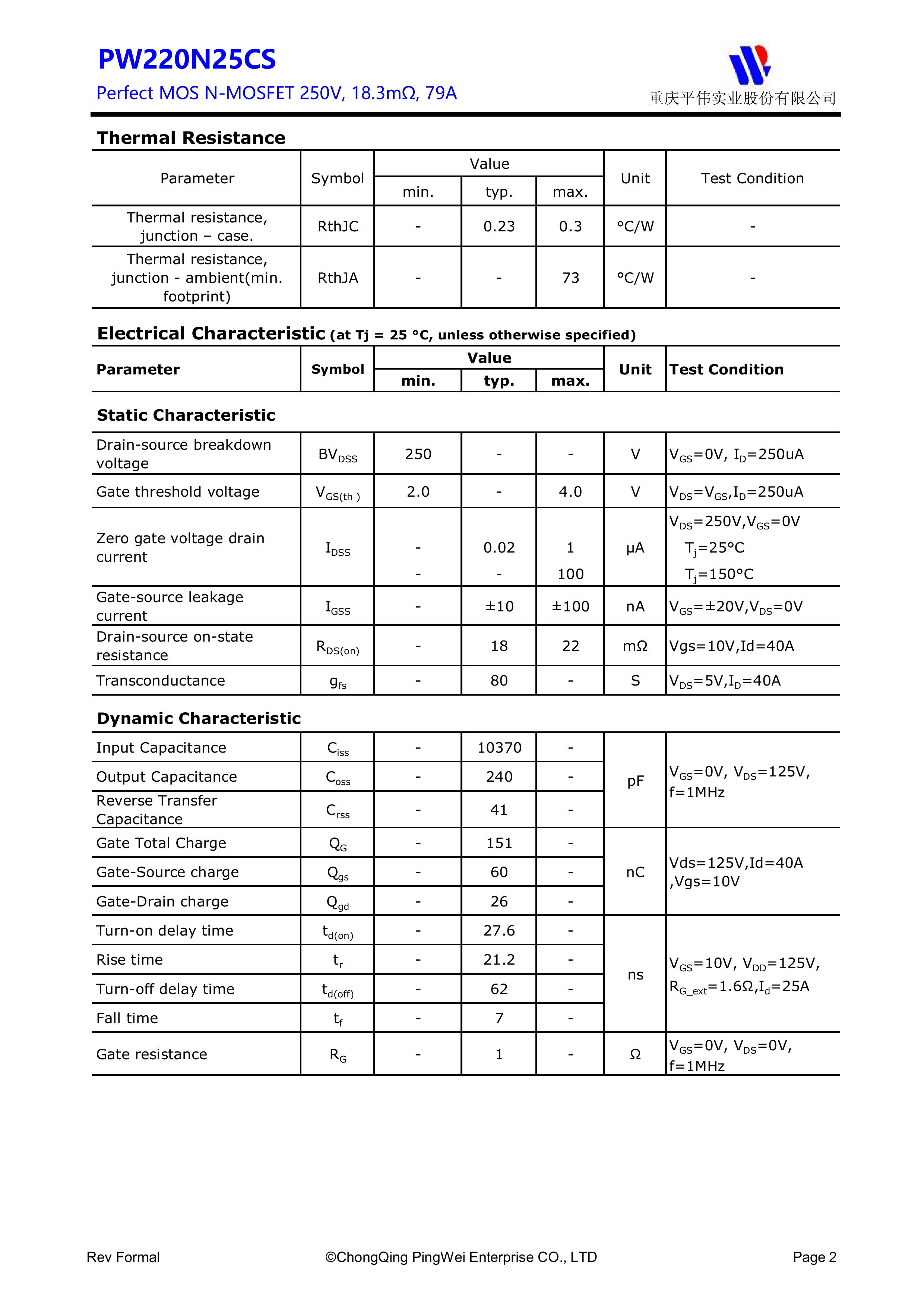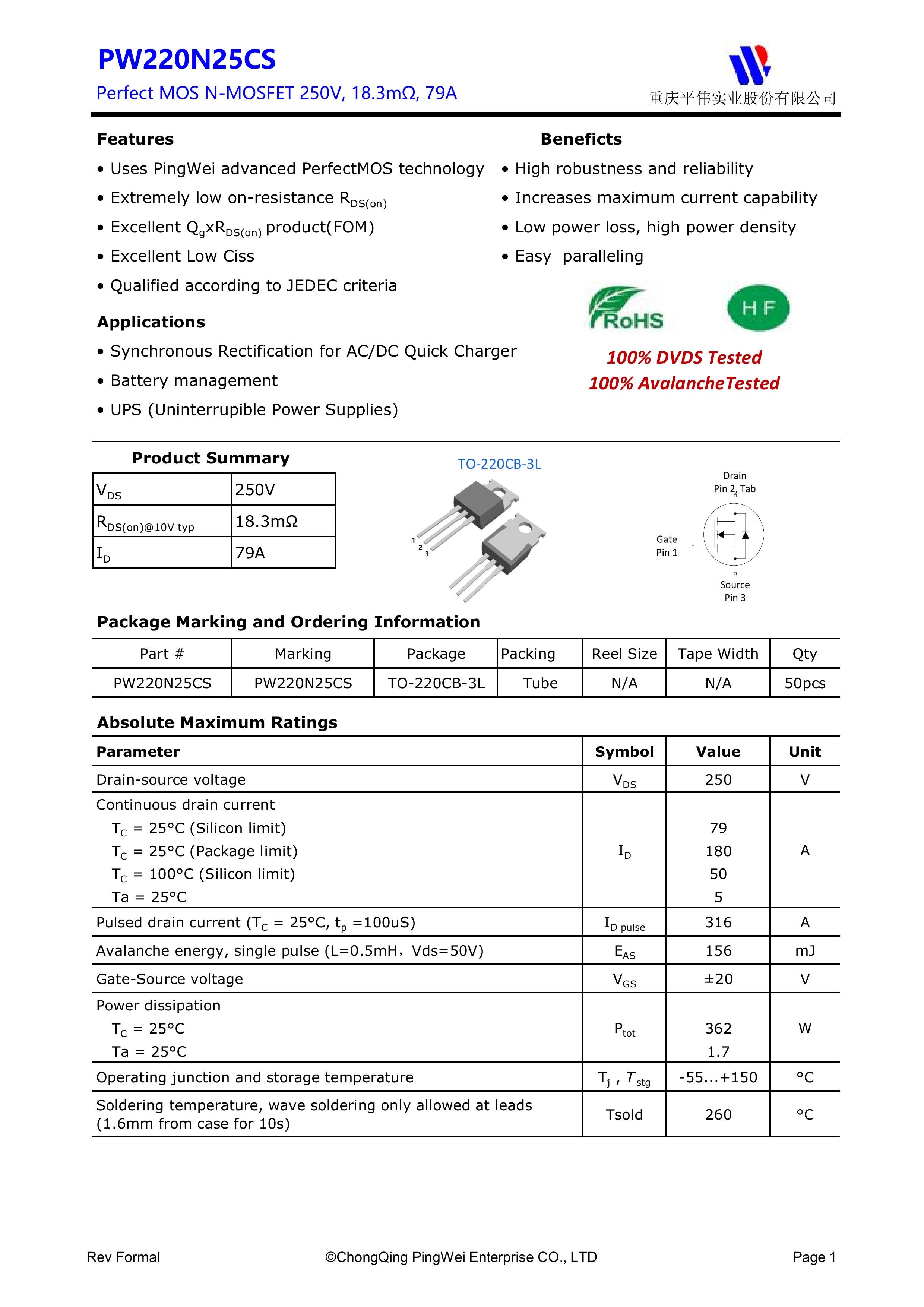 "页面标价非成交价,请联系详询报价” PY/重庆平伟实业 全新原厂原装高频中低压功率控制开关管N型沟道场效应管,250V,79A,0.018Ω,N-Channel,中低压MOSFET:PW220N25CS;电压Vds:250V;电流Id:79A;内阻Rds(on):18mΩ;封装方式:TO-220-3L;最小包装数量:1000pcs/盒-管装。