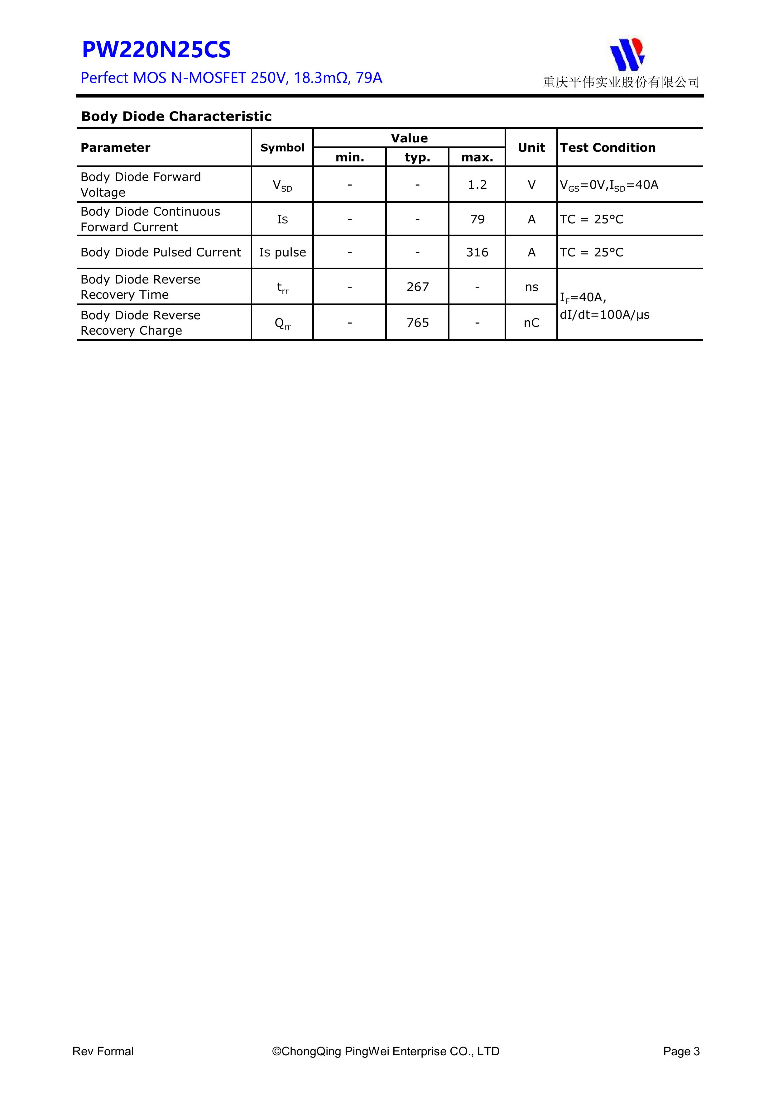 本品采用内置大尺寸芯片,具有适应中低电压低内阻高频高效恢复等电气特性特点。通用于电源、电器、适配器、充电器、充电桩、工控、医疗设备、工业特种电源、高频电源、风光储新能源、逆变器、伺服电机马达等产品电路作控制、开关、整流、放大、钳位、防反接、防逆回流等作用。PY平伟大芯片中低电压大电流低内阻低漏电的分立式功率整流晶体开关管PW220N25CS。