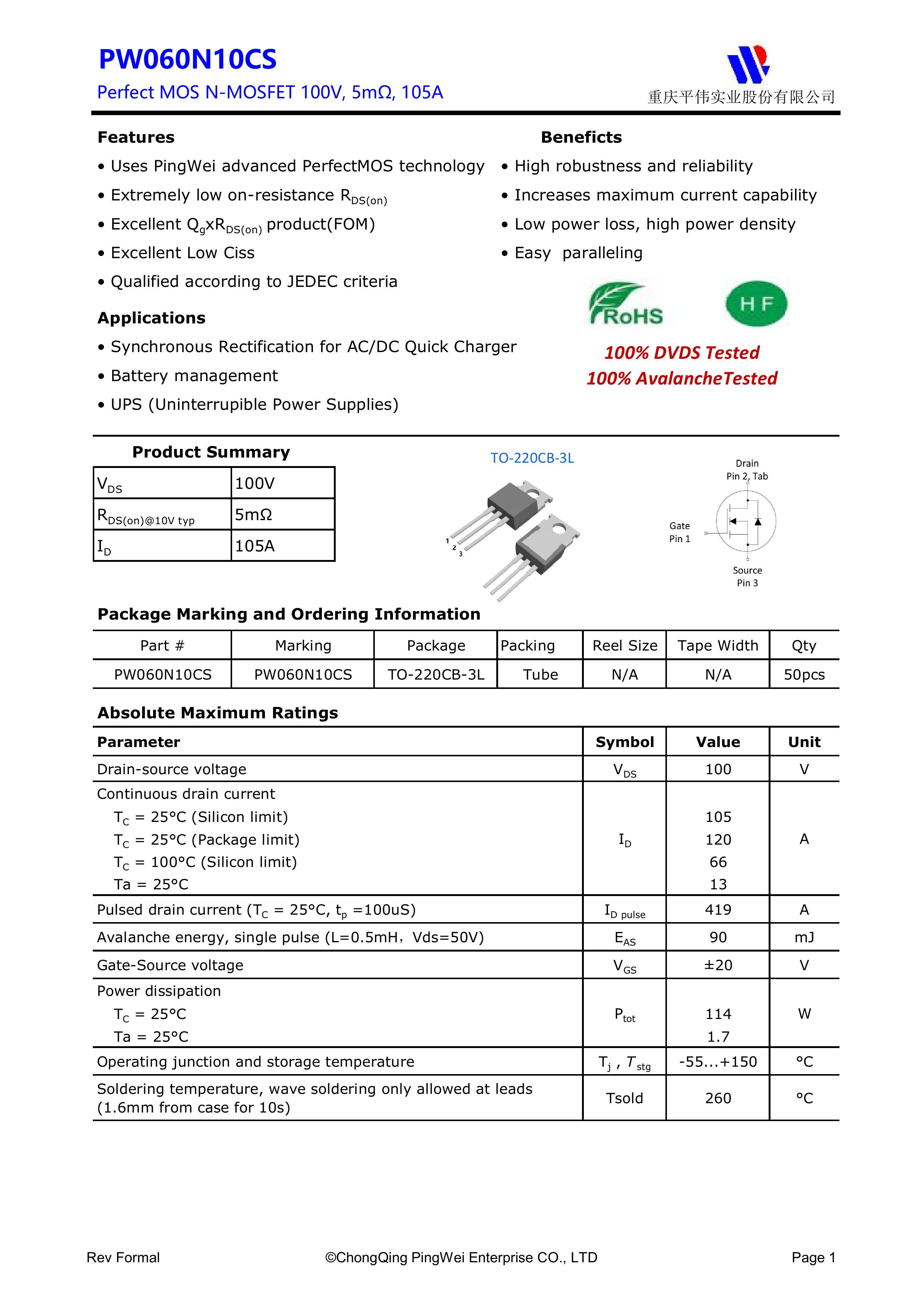 "页面标价非成交价,请联系详询报价” PY/重庆平伟实业 全新原厂原装高频中低压功率控制开关管N型沟道场效应管,100V,105A,5mΩ,N-Channel,中低压MOSFET:PW060N10CS;电压Vds:100V;电流Id:105A;内阻Rds(on):5mΩ;封装方式:TO-220-3L;最小包装数量:1000pcs/盒-管装。