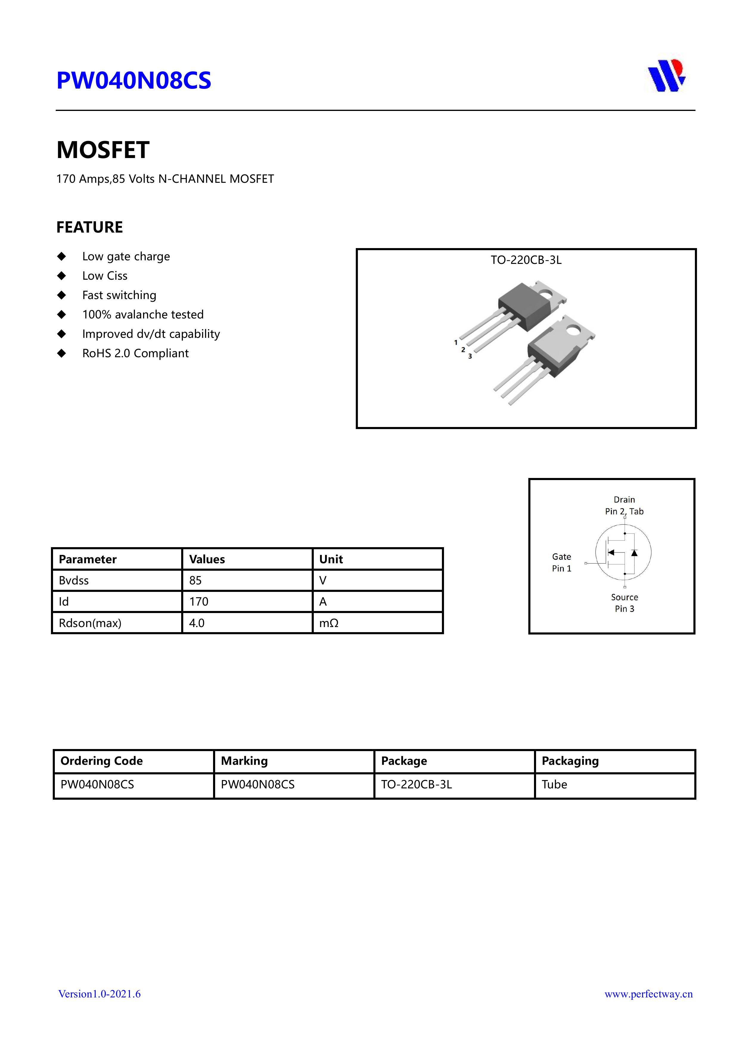 "页面标价非成交价,请联系详询报价” PY/重庆平伟实业 全新原厂原装高频中低压功率控制开关管N型沟道场效应管,85V,170A,3mΩ,N-Channel,中低压MOSFET:PW040N08CS;电压Vds:85V;电流Id:170A;内阻Rds(on):3mΩ;封装方式:TO-220-3L;最小包装数量:1000pcs/盒-管装。