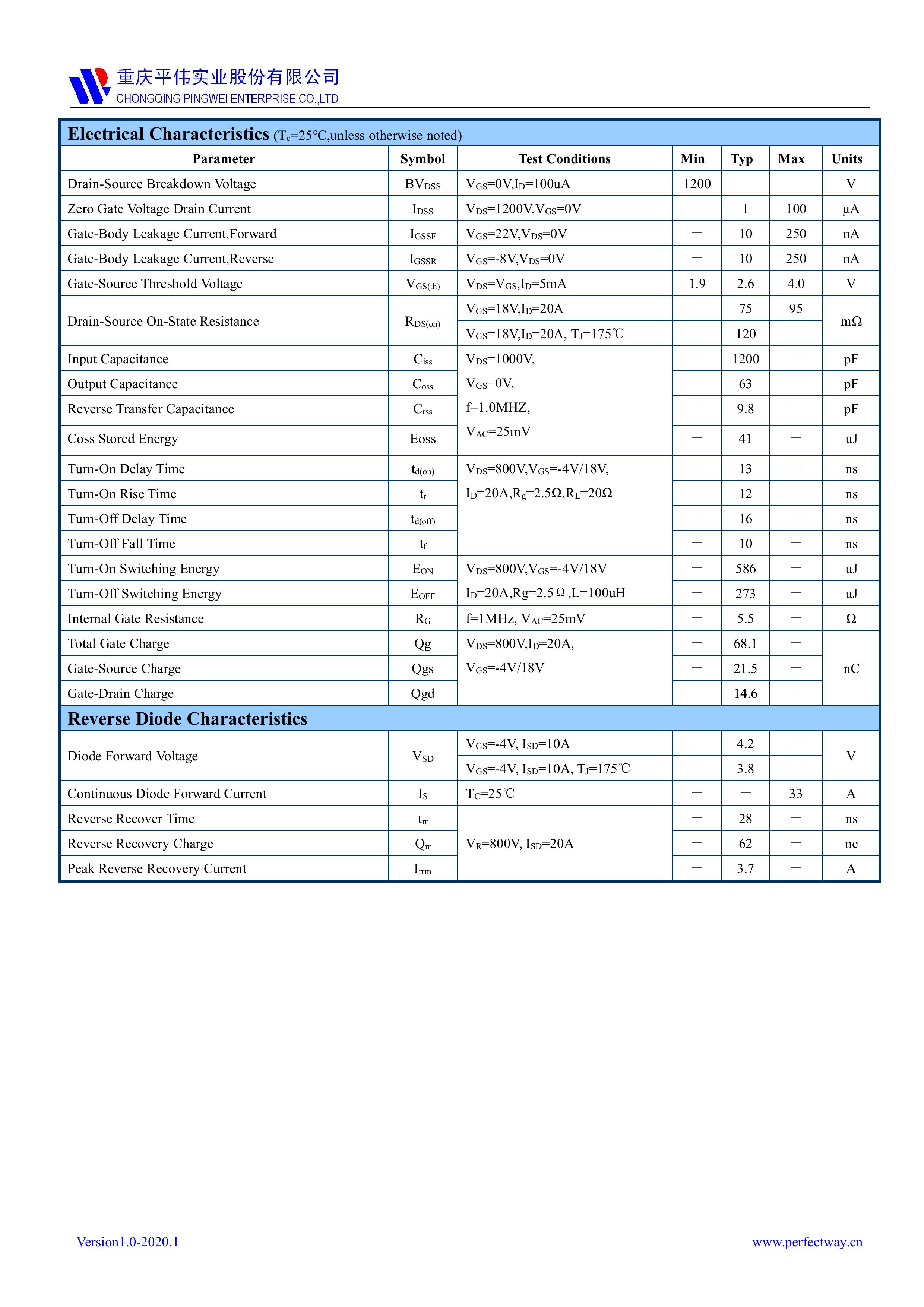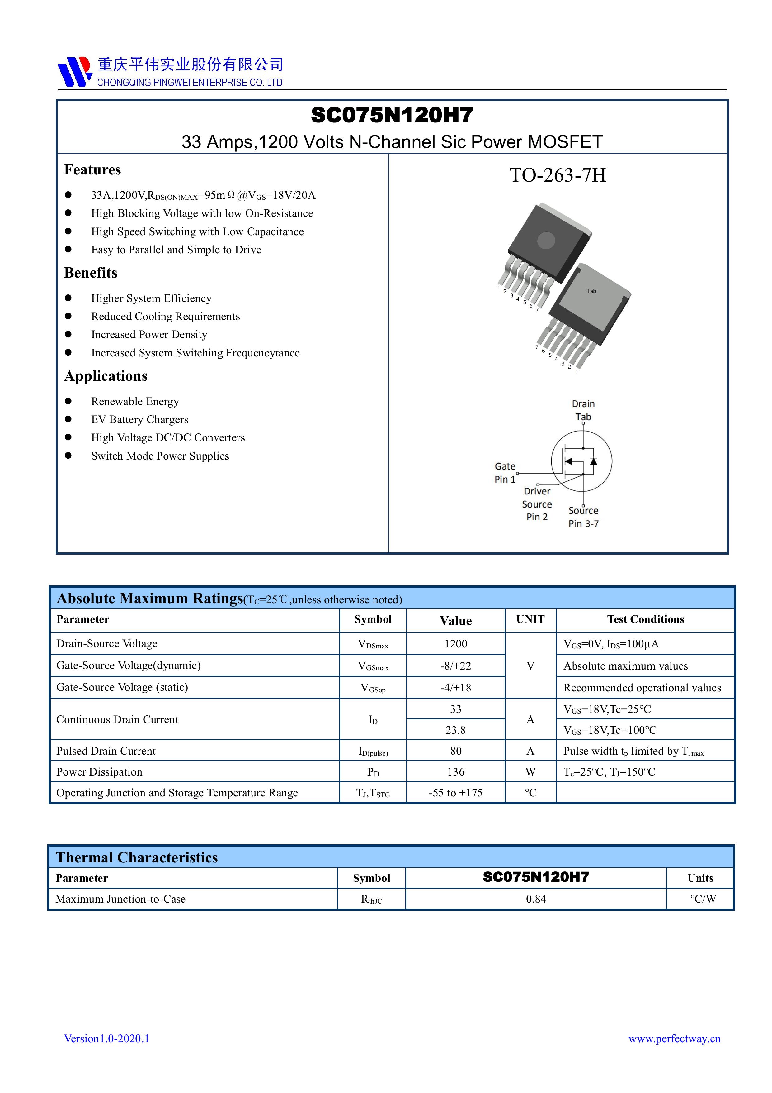 "页面标价非成交价,请联系详询报价” PY/重庆平伟实业 全新原厂原装高频高压功率控制开关管,N型沟道多路输出碳化硅场效应管,1200V,33A,75mΩ,N-Channel,高压MOSFET:SC075N120H7;电压Vds:1200V;电流Id:33A;内阻Rds(on):75mΩ;封装方式:TO-263-7L;最小包装数量:800pcs/盒-管装。
