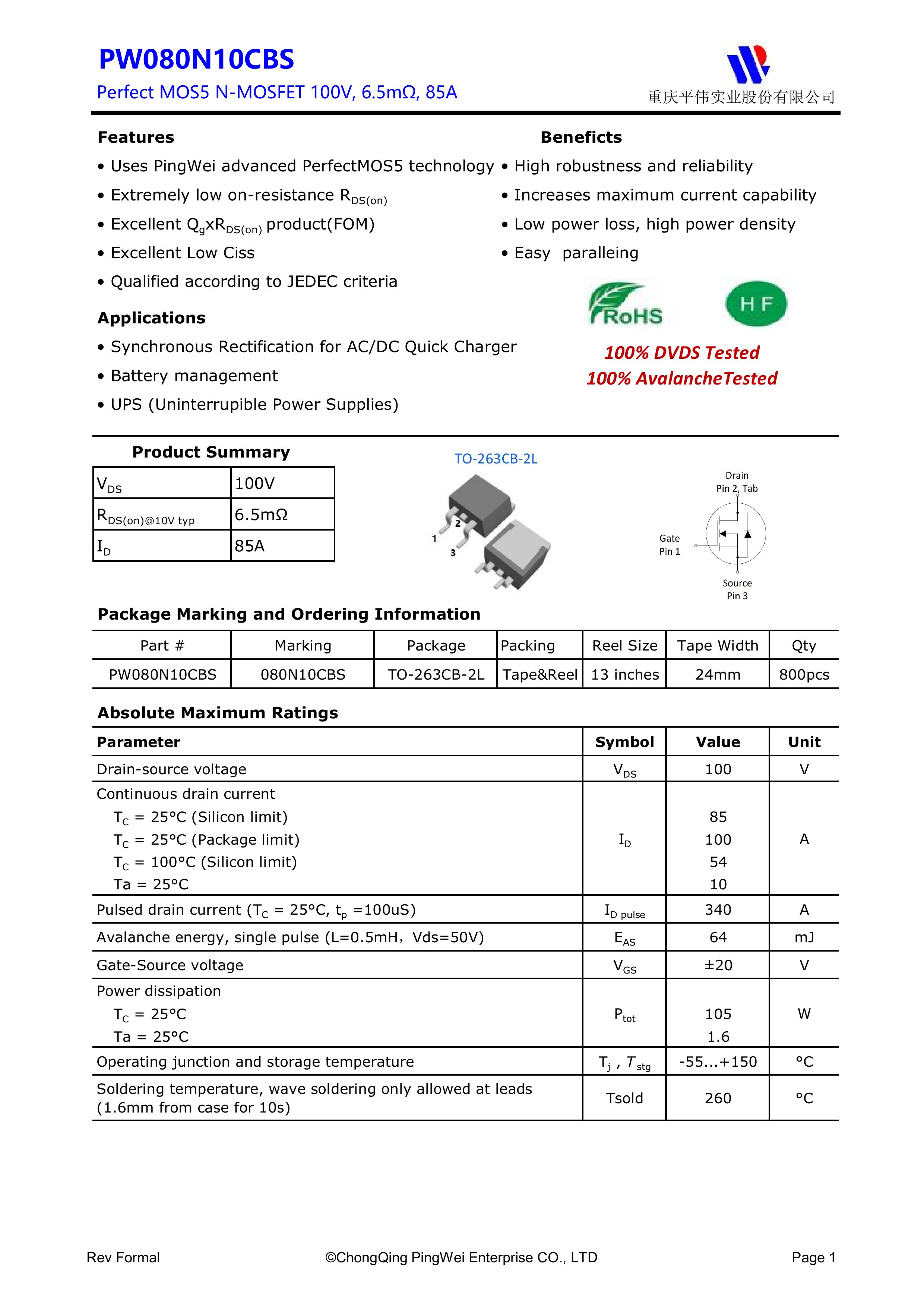 "页面标价非成交价,请联系详询报价” PY/重庆平伟实业 全新原厂原装高频中低压功率控制开关管N型沟道场效应管,100V,85A,6.5mΩ,N-Channel,贴片式中低压MOSFET:PW080N10CBS;电压Vds:100V;电流Id:85A;内阻Rds(on):6.5mΩ;封装方式:TO-263-2L;最小包装数量:800pcs/盘-编带。