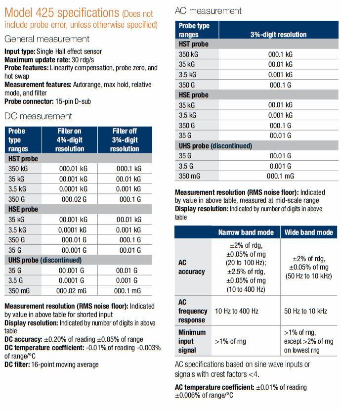 直流测量模式用于测量静态的或者缓慢变化的磁场。在这种模式下,425 型使用探头磁场补偿来校正探头的非线性,从而使直流精度达到 ±0.20%。测量分辨率通过内部滤波得到增强,分辨率可达 4? 位数,通过 USB 接口的读数速率可达每秒 30 个读数。