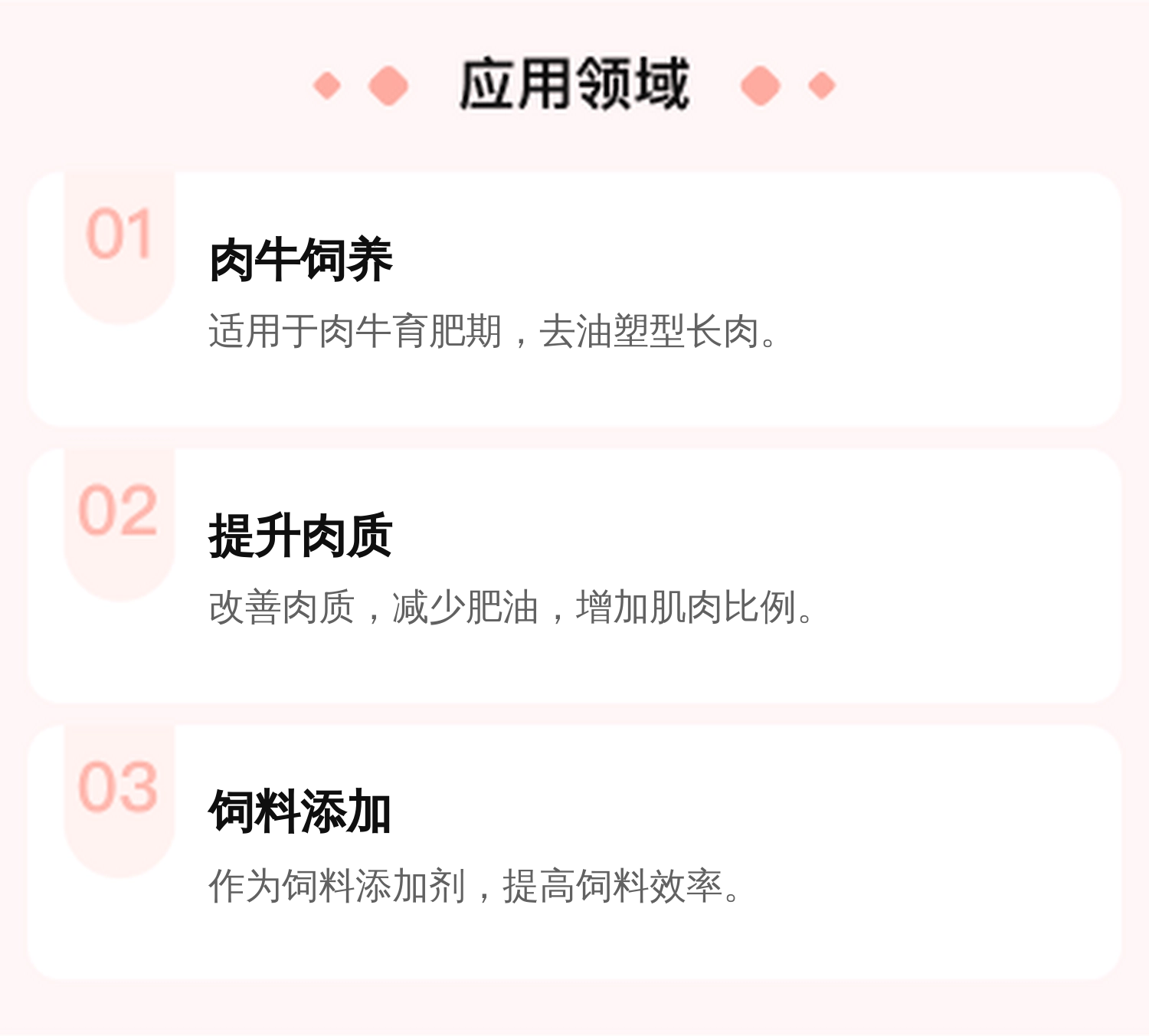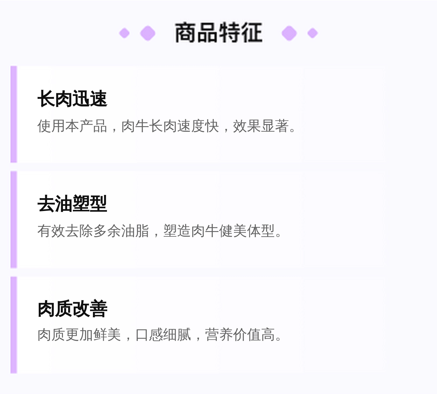 主要用途 | 肉牛去油塑型长肉 | ||