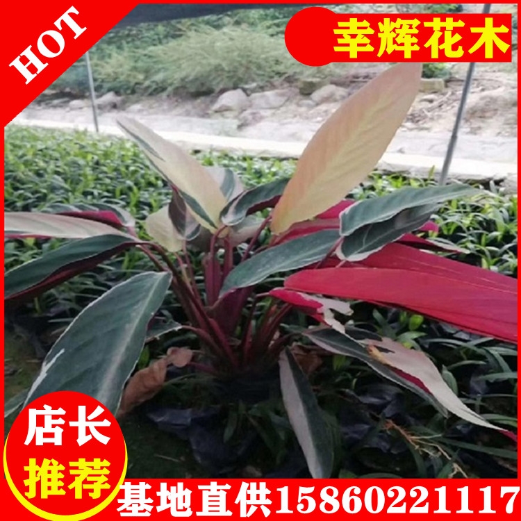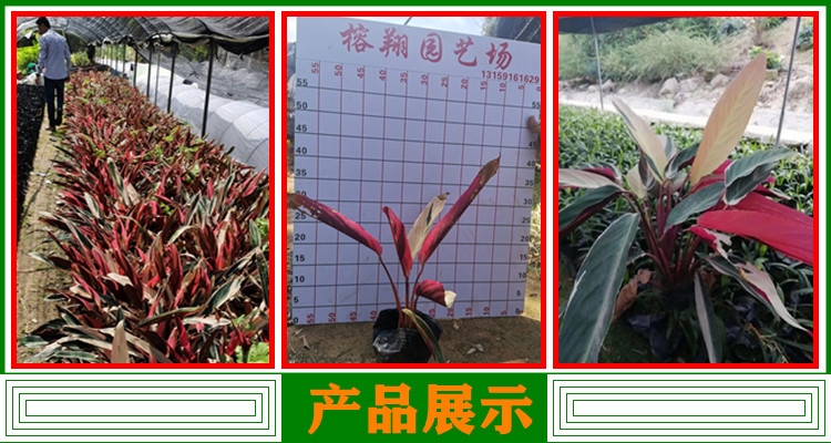 叶柄较短,叶长约25厘米、宽8-15厘米;叶面暗绿色,有光泽,中脉淡绿色,沿中脉两侧有斜向上的绿色条斑,叶背紫红色并有绿色条斑。圆锥花序,苞片及尊片红色、蜡质,小花白色,花期春末至夏初。