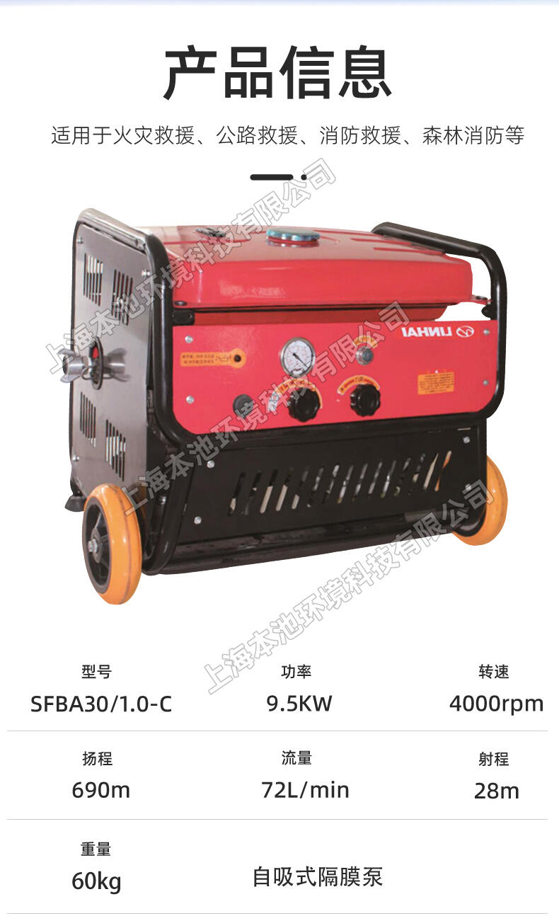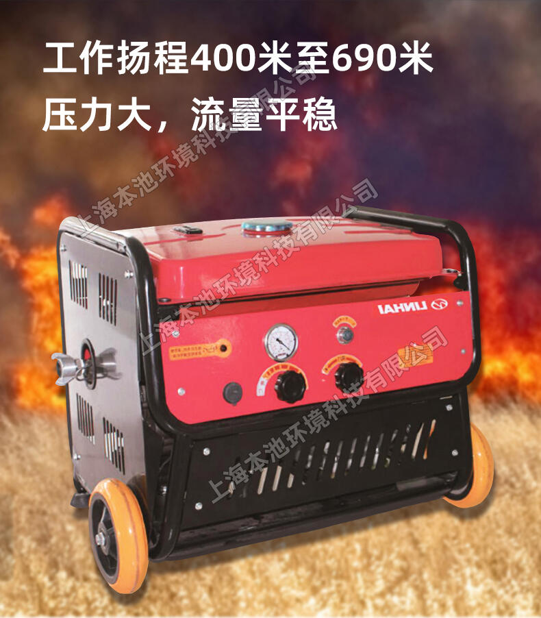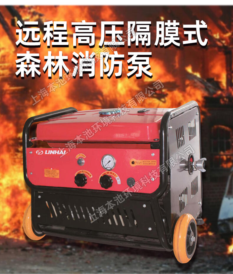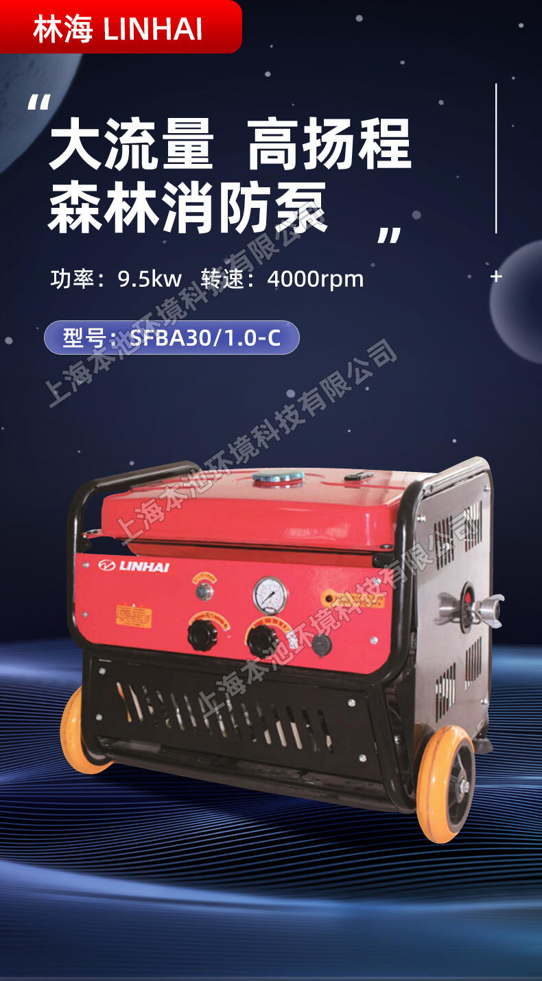 LINHAI林海SFBA30/1.0-C森林消防灭火泵,远程高压隔膜式吸水泵,9.5KW大功率,纯汽油四冲程。压力大,72L/min大流量水泵,噪音低,启动快速,操作简单。扬程400米至690米,水平射程28米,可以通过天然水源或水罐车供水。向山坡上铺设水带至着火点直接进行消防扑救,适用于山体海拔相对较高区域。适用于多种场合火灾、公路、消防、森林消防等。