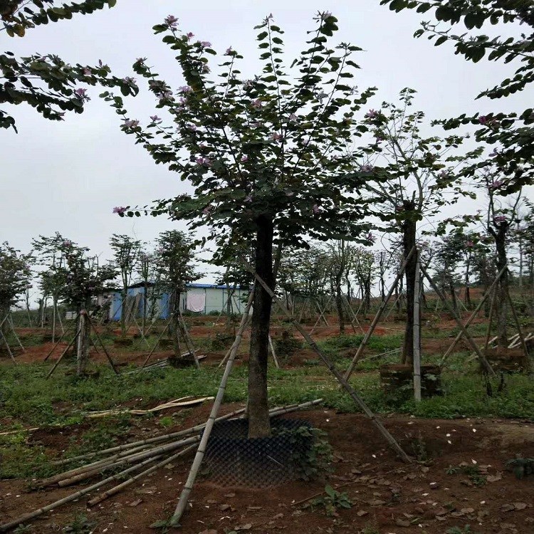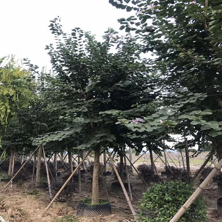 宫粉紫荆形态特征型落叶乔木,树身可达7米高度,单叶互生,长5~12厘米。肾形2裂基部心形,叶脉11至13条,由叶基部呈放射形伸展,浅绿色叶面光滑。叶:叶的先端往内裂开至叶片长度的1/3,基部呈心形,边全缘。叶面光滑,叶背的叶脉上披有短毛。叶脉11至13条,从叶的基部呈放射状生出。叶形与羊蹄甲近似,故名。花:两性,总状花序顶生或腋生,花粉红色或淡紫色,芳香,由五块分离的花瓣组成,其中一块花瓣带红色及黄绿色条纹。具发育雄蕊5枚,花期1~3月,通常早于新叶开放。果:长形荚果,可长达30厘米。成熟时,呈黑色,会裂开放出种子,果期8-9月。