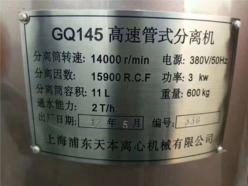 GQ145R高速管式离心机分离因数高达15900xg,分离颗粒直径为0.5微米,适用于乳浊液的分离和高速度悬浮液的澄清,广泛应用在精细化工、生物医药、动植物蛋白果胶提取、中药及口服液的澄清等工业生产中。