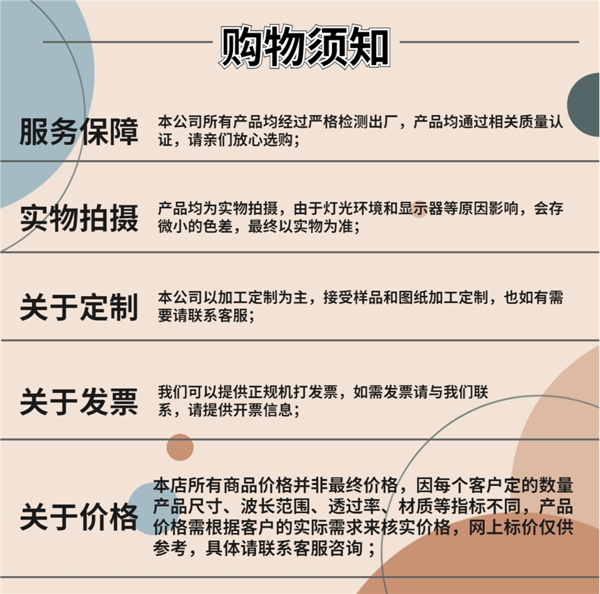 3.此款滤光片为截止型滤光片,使用温度不要超过100°,(如果使用温度在100-200°,需要对镜片进行钢化处理提高耐温性。此种滤光片不适用于温度超过200°的应用)不可用于高功率激光的应用。