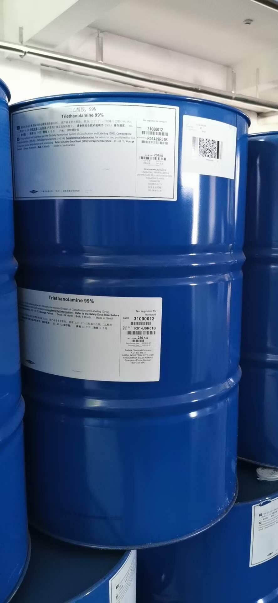 用作脱除气体中二氧化碳或硫化氢的清净液。三乙醇胺和*脂肪酸形成的酯广泛用作洗涤剂、乳化剂、湿润剂和润滑剂,也用于配制化妆用香脂。三乙醇胺还用作防腐剂和防水剂、分析试剂和溶剂等。在丁腈橡胶聚合中作为活化剂,也可在酸性条件下作油类、蜡类的乳化剂、稳定剂,纺织物的软化剂。是绦纶等合成纤维纺丝油剂的组分之一。