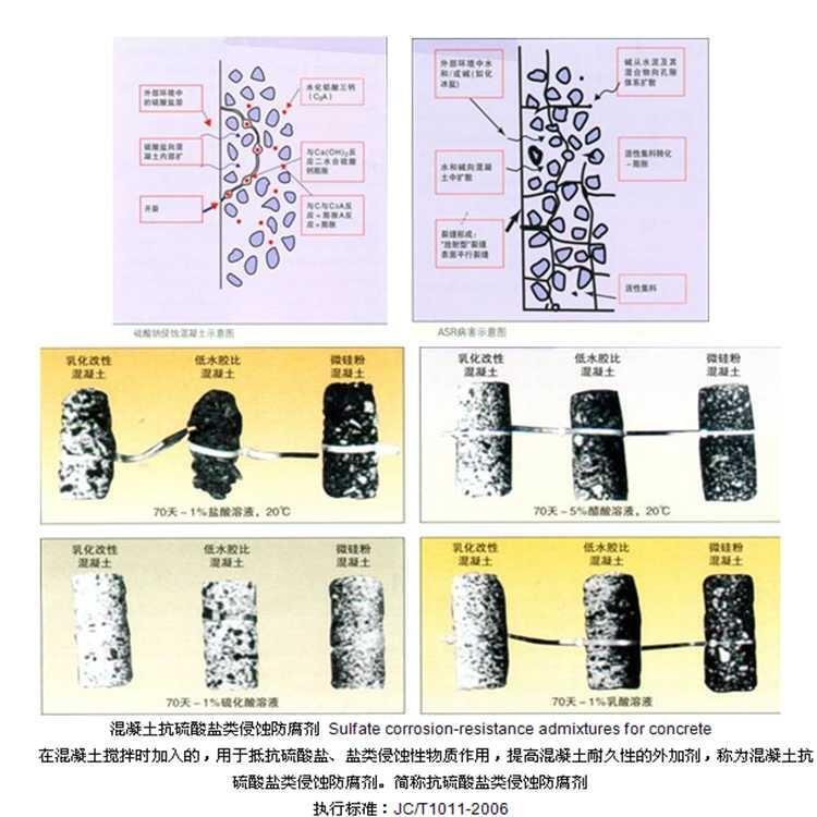 混凝土防腐剂抗硫酸盐能力已超过《铁道混凝土及砌石工程规范》附录十三中规定的AS抗硫酸盐水泥水平。对混凝土的耐久性能和施工性能有很大的提高。采用混凝土防腐剂生产的钢筋混凝土具有耐腐蚀、抗冻融、高强度、不渗透、收缩小、减水率高的优异性能。