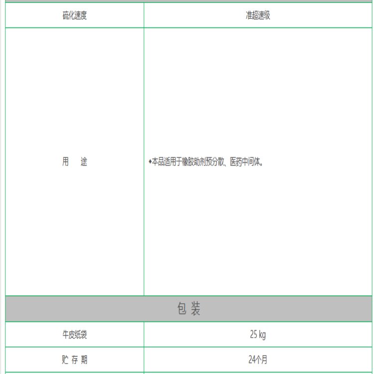 用途范围 | 天然胶及多种合成胶用促进剂,可产生平坦和中速硫化,硫化温度较高,有显著的后效性,不会早期硫化,操作安全,易分散,不污染,硫化胶耐老化 | ||