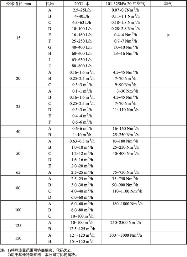 LZ-25A0B6A0D0表示金属管转子流量计,口径DN25mm,流体方向下进上出,浮子材质304,压力PN2.5,精度2.0级,大开面指针式,无阻尼,流量0.3~3m3/h的液体。