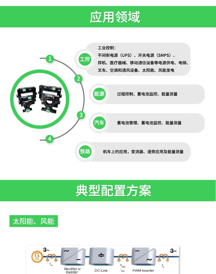 适用于电流监控及电池应用、逆变电源及太阳能电源管理系统、直流屏及直流马达驱动、电镀、焊接应用、变频器,UPS伺服控制等系统电流信号采集和反馈控制。