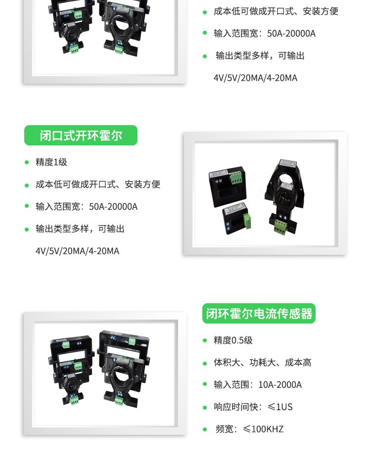 霍尔电流传感器主要适用于交流、直流、脉冲等复杂信号的隔离转换,通过霍尔效应原理使变换后的信号能够直接被AD、DSP、PLC、二次仪表等各种采集装置直接采集和接受,响应时间快,电流测量范围宽精度高,过载能力强,线性好。