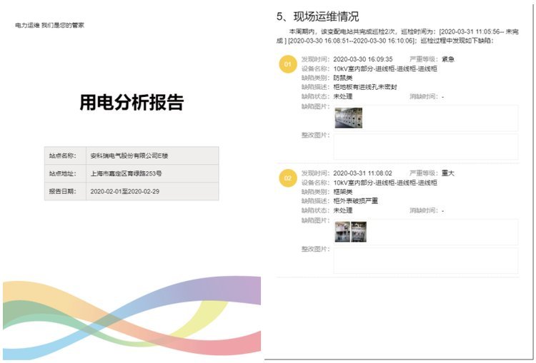 系统自动汇总变电所一个月的运行数据,对变压器负荷、配电回路用电量、功率因数、报警事件等进行统计分析,并列出在该周期内巡检时发现的各类缺陷及处理情况;