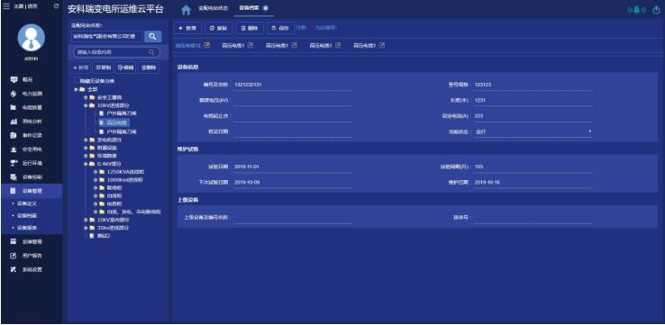 系统可配置每个变电所内变压器、进线柜、出线柜、计量柜、高压电缆等设备信息,记录设备的厂家、型号、投运日期等,并可通过报表统计近期需要保养或更换的设备;