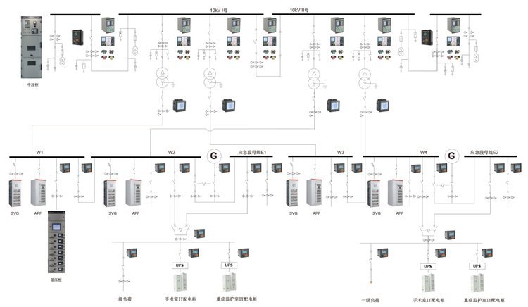 ??电力监控系统主要针对开闭所和10/0.4kV变电所,对高压回路配置微机保护装置及多功能仪表进行保护和监控,对0.4kV出线配置多功能计量仪表,用于测控出线回路电气参数和用能情况。同时对医院重要设备如柴油发电机、无功补偿装置、有源滤波装置、UPS、隔离电源系统状态进行监测。