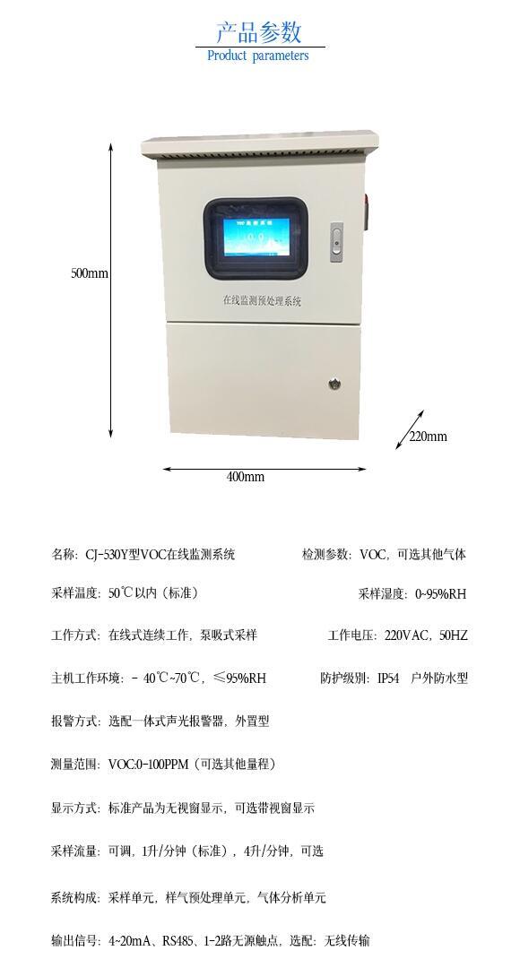 VOC在线监测系统是一款在线检测VOC气体浓度的设备。主要适用于厂界,厂区或车间、锅炉等场合的VOC气体浓度检测,检测VOC气体是否达到下限的浓度标准,并可以实时在线显示进行浓度超标报警并无线上传。主要原理:检测仪采用PID测被测气体种VOC气体的浓度,在显示屏上实时显示被测气体浓度,并将数据信号向外传输到PLC或者电脑等终端。系统适合于锅炉烟气或废气排放烟道。