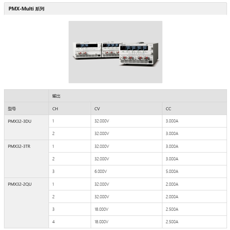 “PMX-Multi系列”是一种具有四个隔离输出通道的小巧型多输出直流电源。各通道可同时输入和同时可调(跟踪)。另外,通过使用标配的通信接口(LAN,USB,RS232C),可轻松实现系统扩展。可通过系列调节器方式实现低噪声,稳定的输出,因此适用于晶体管,IC电路,运算放大器等实验的研究,开发,以及生产线用途。