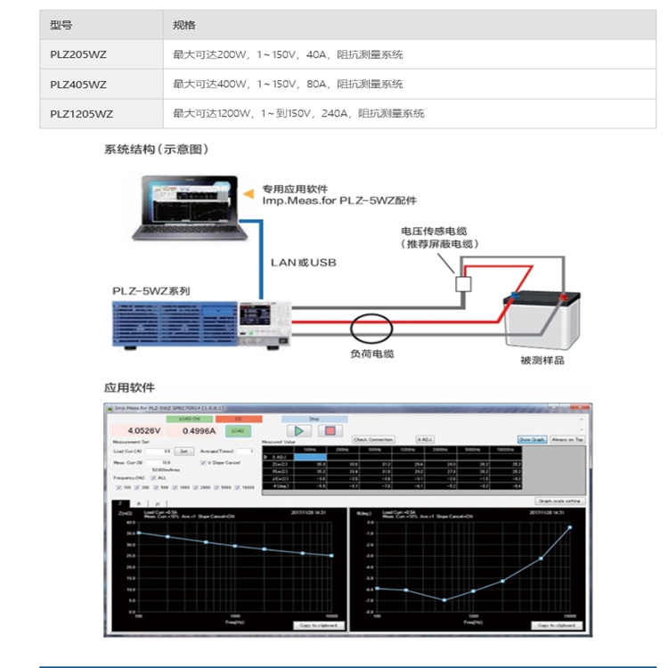 PLZ-5WZ系列在PLZ-5W系列之上追加了采用交流方式的阻抗测量功能,是一种通过应用软件进行控制的阻抗测量系统。之前的PLZ-5W系列除了具备恒流,恒电阻,恒压,恒功率,恒流+恒压,恒电阻+恒压的6种动作模式外,还新加了对于输入电压可随意设置电流的任意IV特性(ARB)模式,是一种高性能的直流电子负载装置。