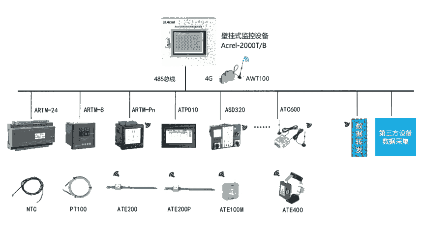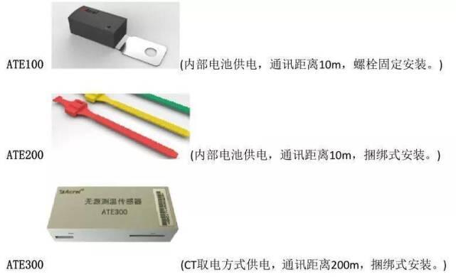 说明:ASD300/320 智能操控装置可连接 12 路无线温度传感器,无源(CT 取电)方式为 ATE300(捆绑式安装),有源(电池供电)方式为 ATE100(螺栓式安装,主要用于电缆/铜排等螺丝固定的搭接点)和 ATE200(表带式,主要用于断路器触头等接点捆绑安装,因安装较 ATE100 更方便,电缆/铜排等搭接点也常选用)。