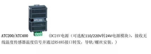 说明:ATC400 无线温度收发器可连接 240 路无源无线温度传感器 ATE300(捆绑式安装),可接收多台柜内的无线温度传感器温度信号。
