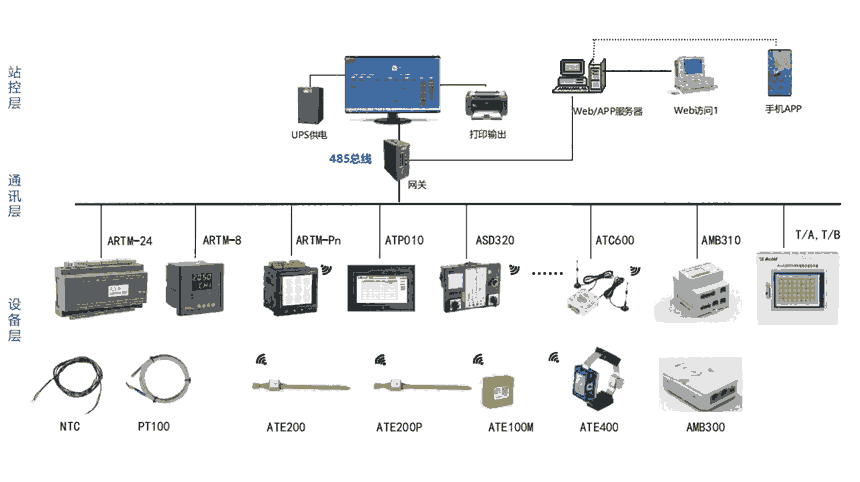 说明:触摸屏通过 RS485 总线连接多个 ATC200 实现开关柜温度集中显示,每个触摸屏可接20只ATC200,每个ATC200可接12只有源无线温度传感器。