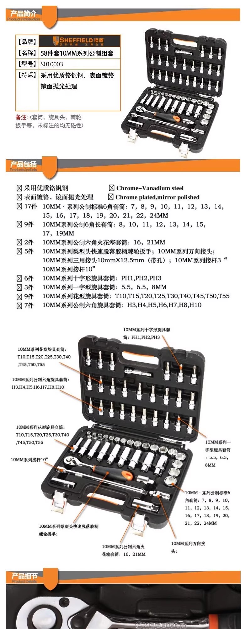 钢盾汽修机修工具套装 10MM快脱棘轮扳手套筒组套 S010003 58件套