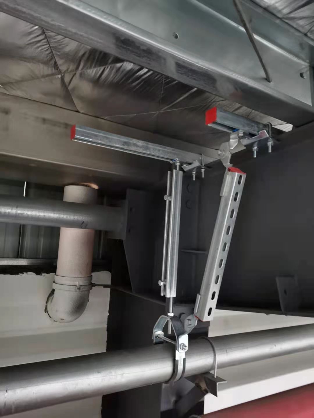 4)横粱槽钢的安装、水管的固定安装横梁槽钢,用 P 型夹或者Ω型夹固定水管在横梁槽钢上